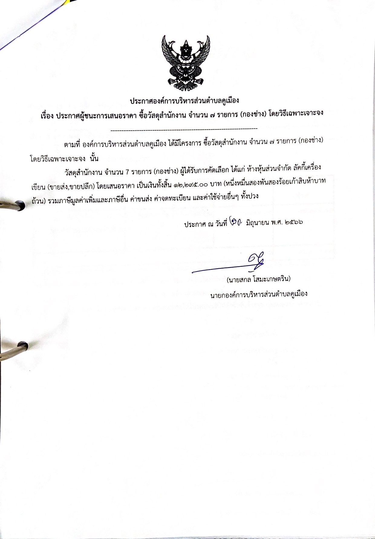 ประกาศผู้ชนะการเสนอราคา ซื้อวัสดุสำนักงาน จำนวน 7 รายการ (กองช่าง) โดยวิธีเฉพาะเจาะจง