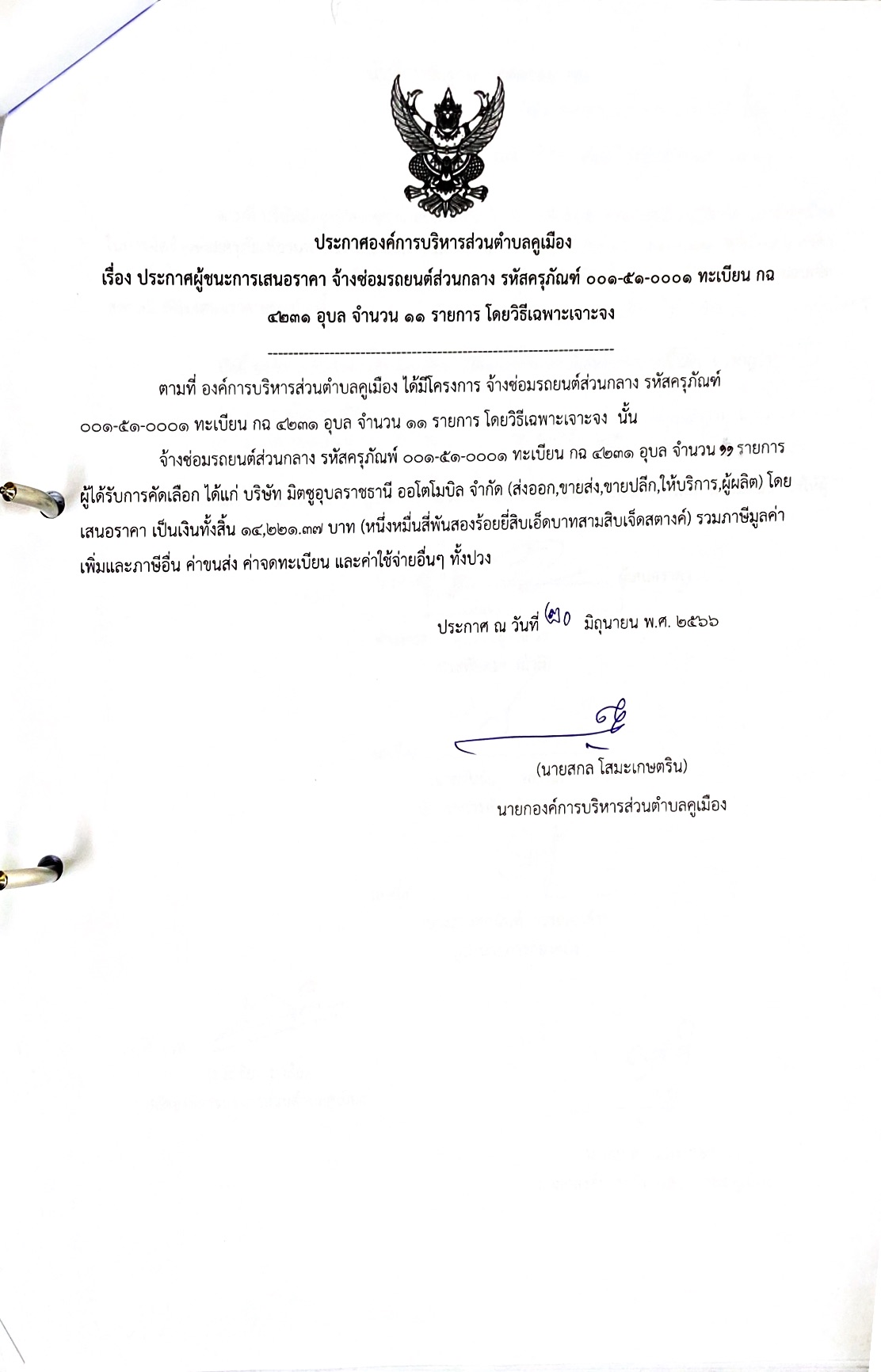 ประกาศผู้ชนะการเสนอราคา จ้างซ่อมรถยนตืส่วนกลาง รหัสครุภัณฑ์ 001-51-0001 ทะเบียน กฉ 4231 อุบล จำนวน 11 รายการ โดยวิธีเฉพาะเจาะจง
