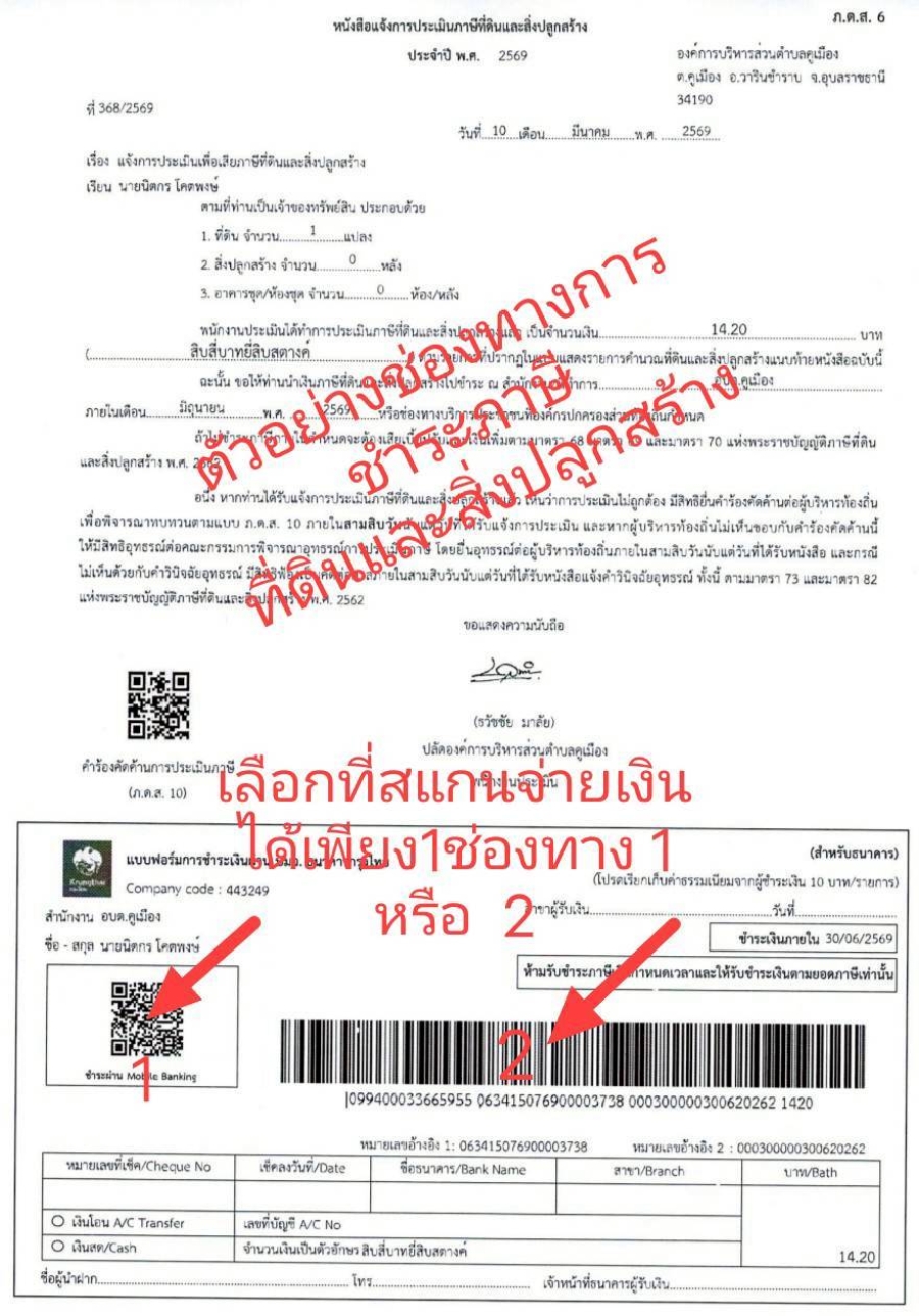 ประชาสัมพันธ์ ตัวอย่างการชำระภาษีที่ดินและสิ่งปลูกสร้างผ่านคิวอาร์โค้ดตามหนังสือที่แจ้งไปยังผู้ที่ต้องชำระภาษี ประจำปี 2569