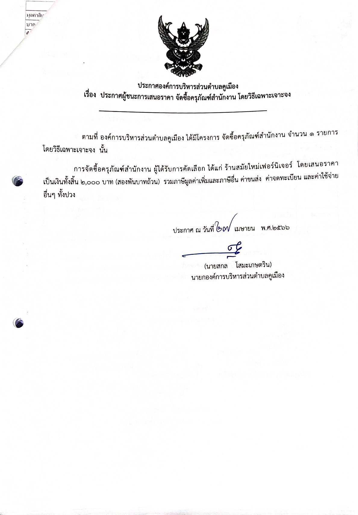 ประกาศผู้ชนะการเสนอราคา จัดซื้อครุภัณฑ์สำนักงาน โดยวิธีเฉพาะเจาะจง