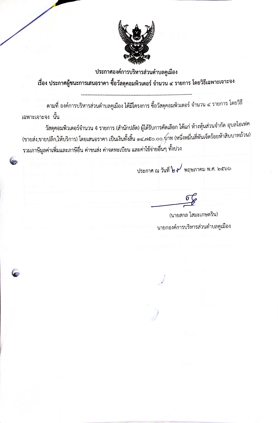 ประกาศผู้ชนะการเสนอราคา ซื้อวัสดุคอมพิวเตอร์ 4 รายการ โดยวิธีเฉพาะเจาะจง วันจันทร์, 29 พฤษภาคม 2566 15:56 Print Email ประกาศผู้ชนะการเสนอราคา ซื้อวัสดุคอมพิวเตอร์ 4 รายการ โดยวิธีเฉพาะเจาะจง ดาวน์โหลดเอกสาร ประกาศผู้ชนะการเสนอราคา ซื้อวัสดุคอมพิวเตอร์ 4 รายการ โดยวิธีเฉพาะเจาะจง (193 Downloads) back to top