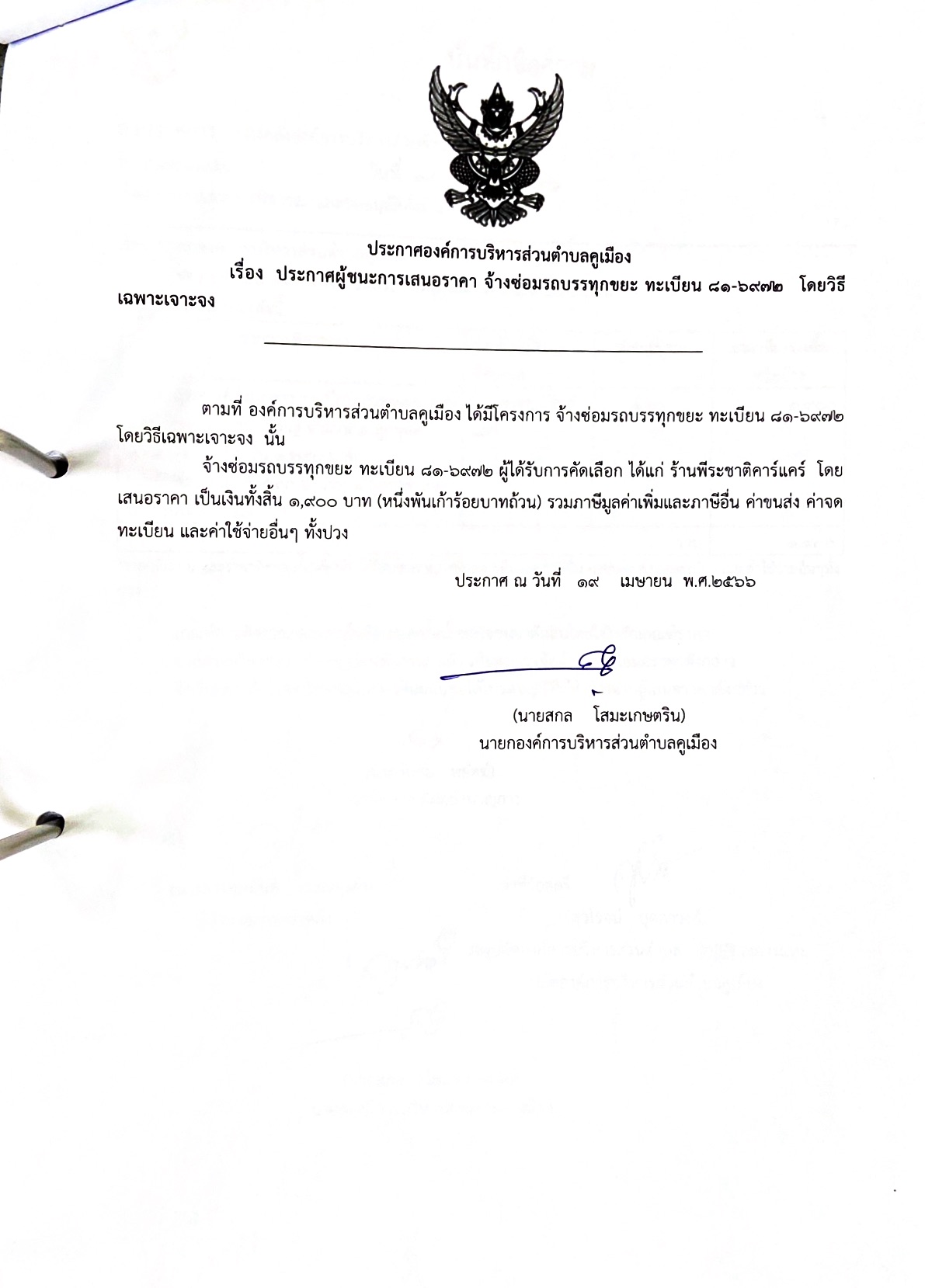 ประกาศผู้ชนะการเสนอราคา จ้างซ่อมรถบรรทุกขยะ ทะเบียน 81-6972 โดยวิธีเฉพาะเจาะจง วันพุธ, 19 เมษายน 2566 09:56 Print Email ประกาศผู้ชนะการเสนอราคา จ้างซ่อมรถบรรทุกขยะ ทะเบียน 81-6972 โดยวิธีเฉพาะเจาะจง ดาวน์โหลดเอกสาร ประกาศผู้ชนะการเสนอราคา จ้างซ่อมรถบรรทุกขยะ ทะเบียน 81-6972 โดยวิธีเฉพาะเจาะจง (185 Downloads) back to top