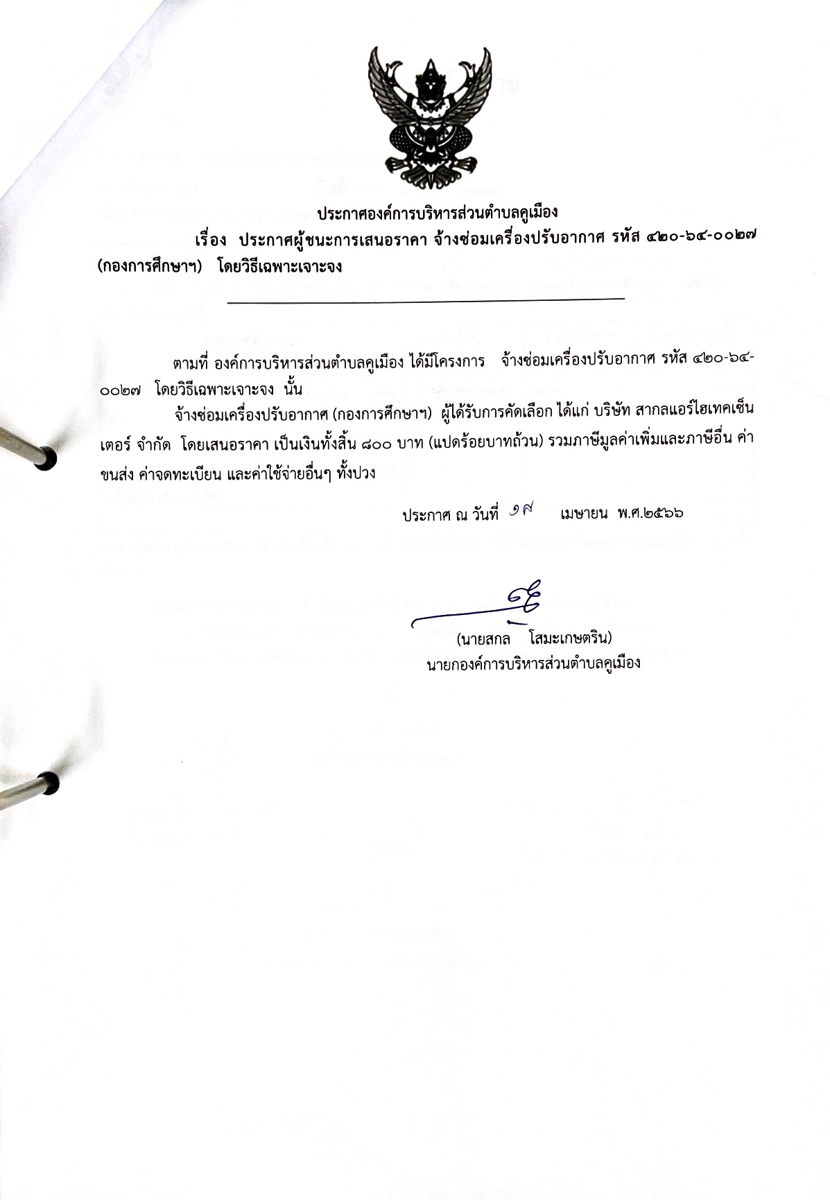 ประกาศผู้ชนะการเสนอราคา จ้างซ่อมเครื่องปรับอากาศ รหัส 420-64-0027 (กองการศึกษา) โดยเฉพาะเจาะจง