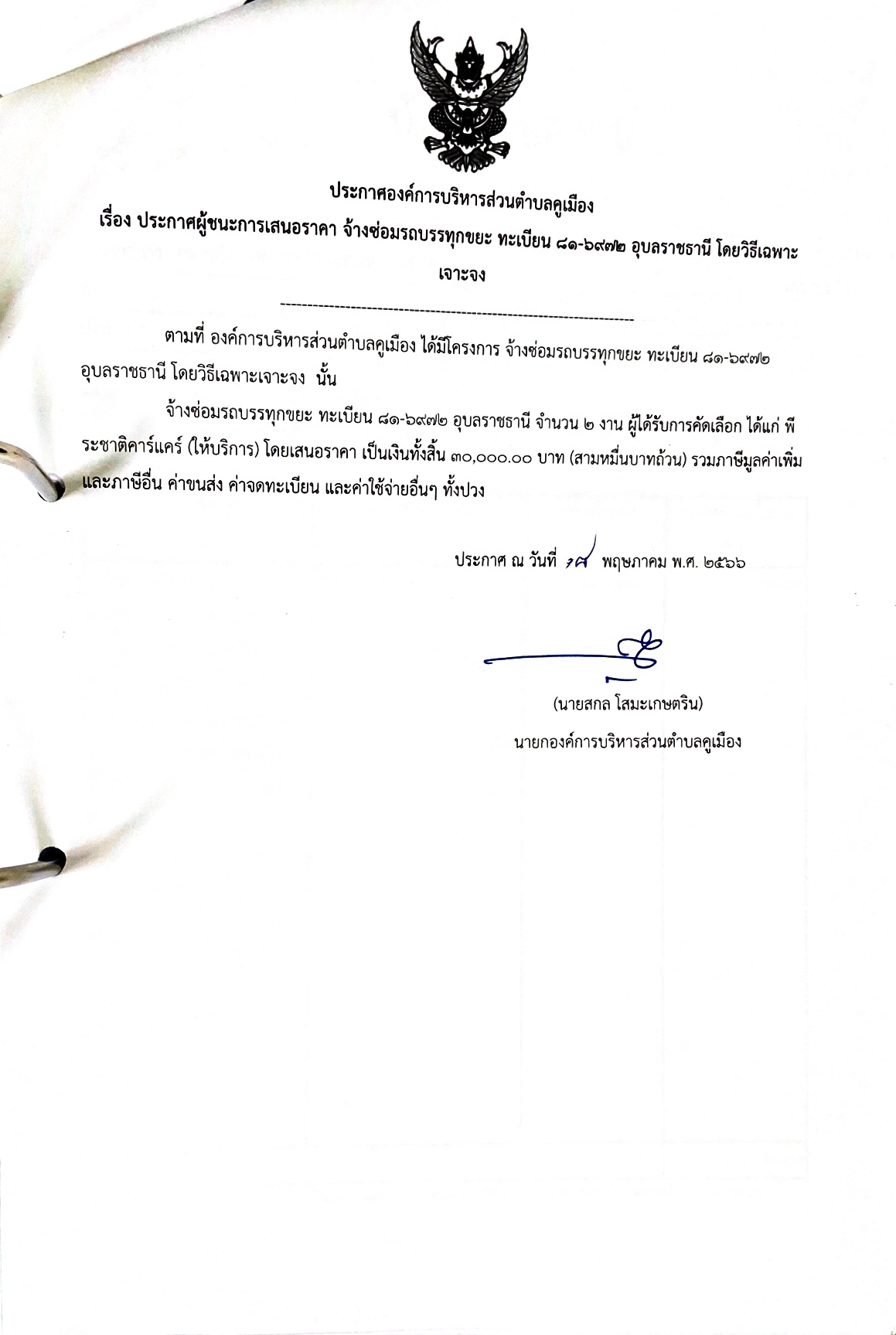 ประกาศผู้ชนะการเสนอราคา จ้างซ่อมรถบรรทุกขยะ ทะเบียน 81-6972 อุบลราชธานี โดยวิธีเฉพาะเจาะจง