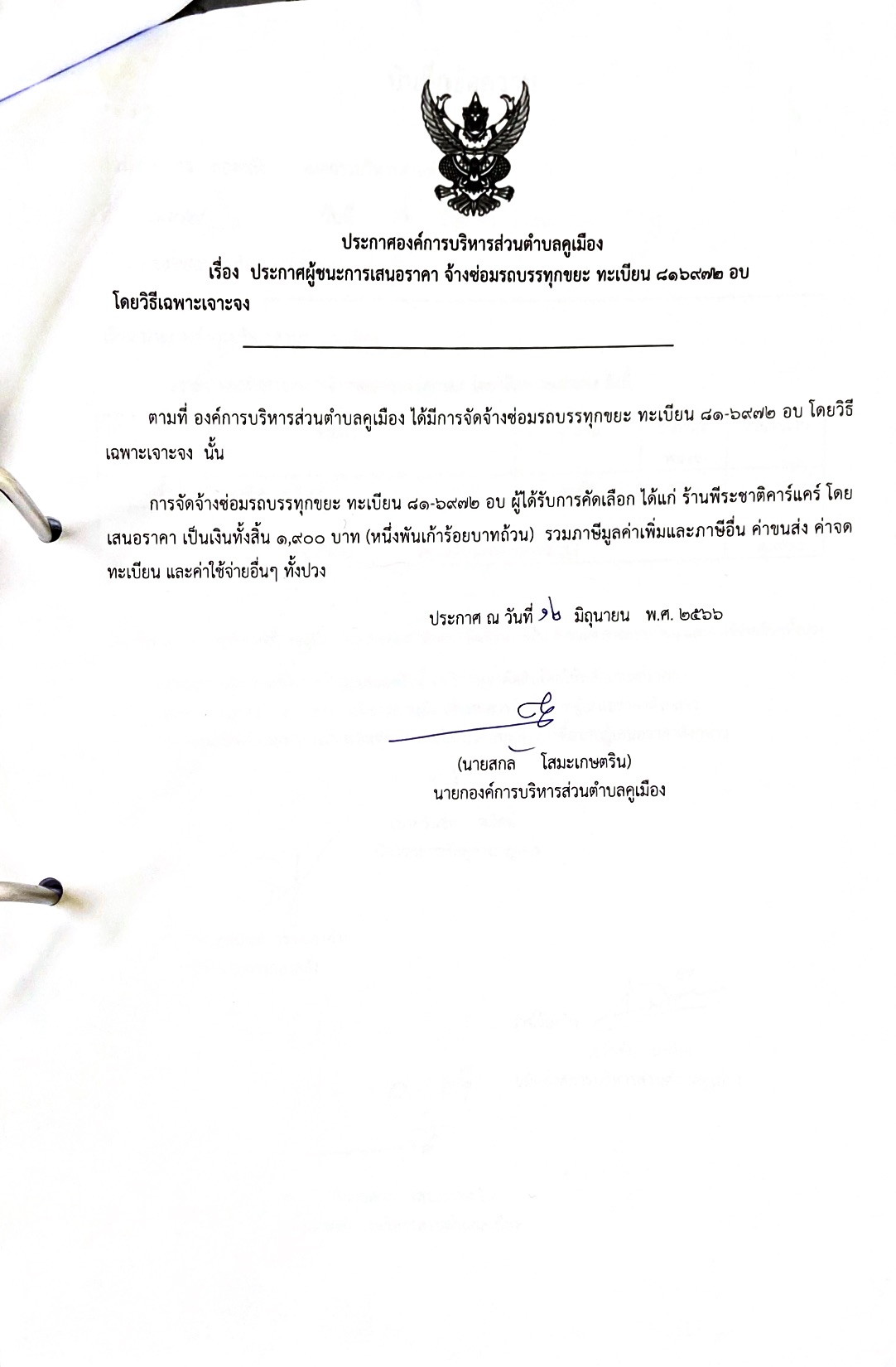 ประกาศผู้ชนะการเสนอราคา จ้างซ่อมรถบรรทุกขยะ ทะเบียบ 816972 อบ โดยวิธีเฉพาะเจาะจง