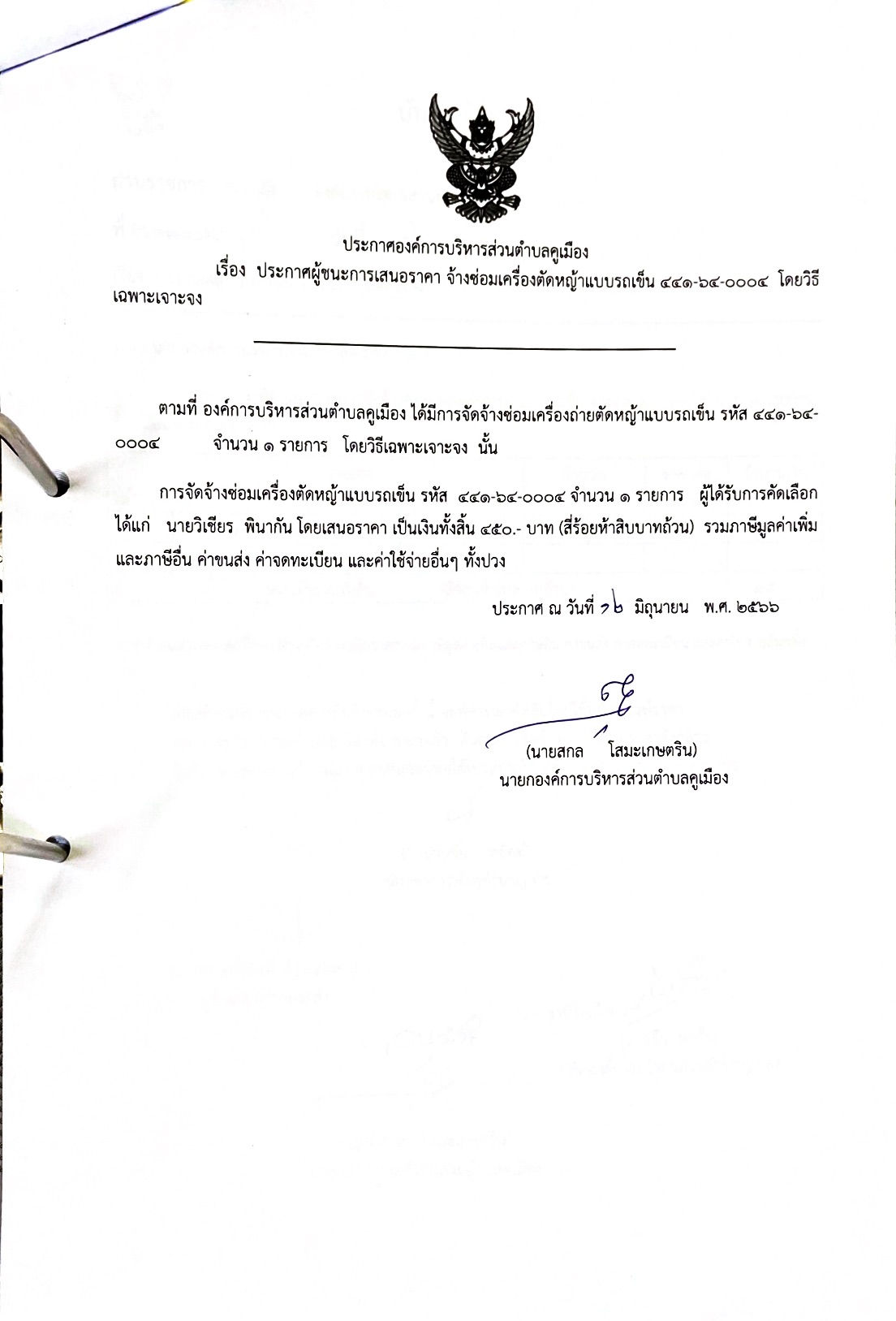ประกาศผู้ชนะการเสนอราคา จ้างซ่อมเครื่องตัดหญ้าแบบรถเข็น 441-64-0004 โดยวิธีเฉพาะเจาะจง