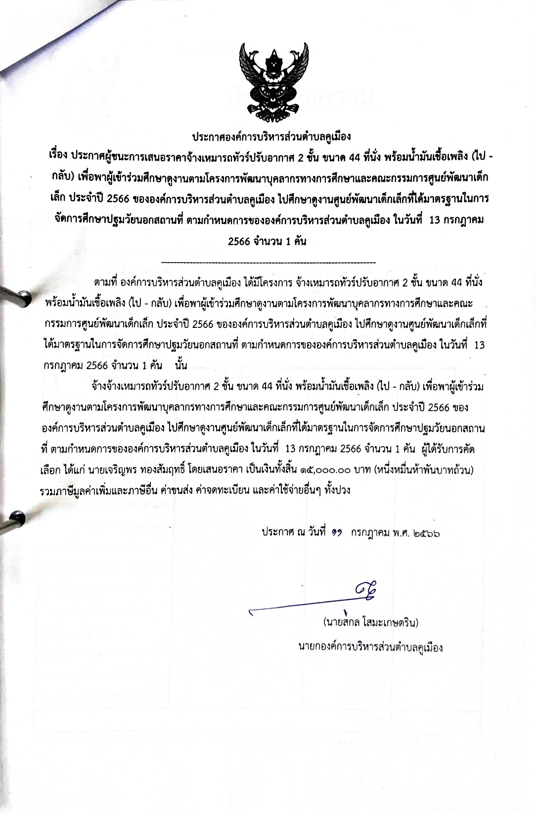 ประกาศผู้ชนะการเสนอราคาจ้างเหมารถทัวร์ปรับอากาศ 2 ชั้น ขนาด 44 ที่นั่ง พร้อมน้ำมันเชื้อเพลิง (ไป - กลับ ) เพื่อพาผู้เข้าร่วมศึกษาดูงานตามโครงการพัมนาบุคคลกรทางการศึกษาและคณะกรรมการศูนย์เด็กเล็ก ประจำปี 2566 ขององค์การบริกหารส่วนตำบลคูเมือง