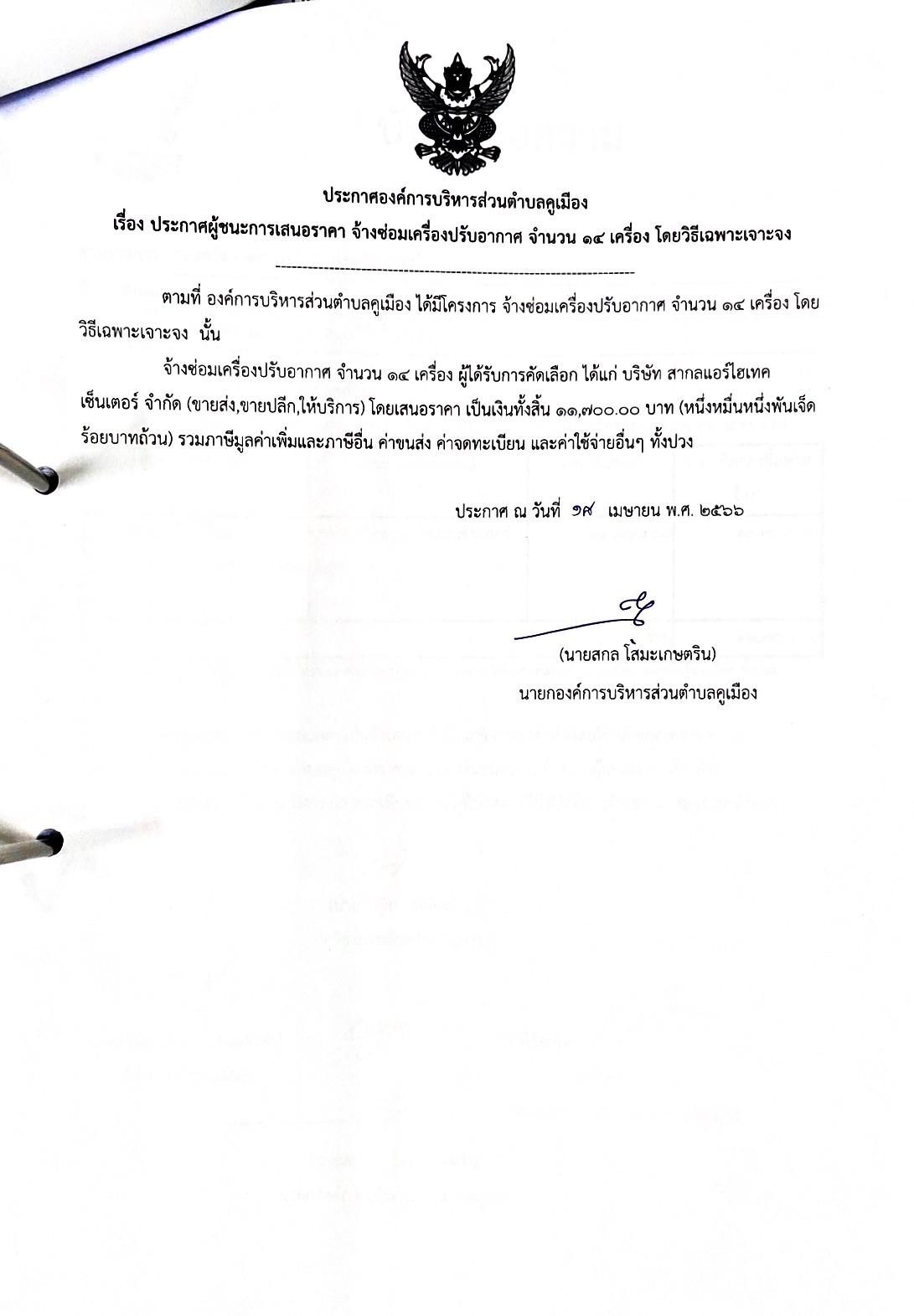 ประกาศผู้ชนะการเสนอราคา จ้างซ่อมเครื่องปรับอากาศ จำนวน 14 เครื่อง โดยวิธีเฉพาะเจาะจง